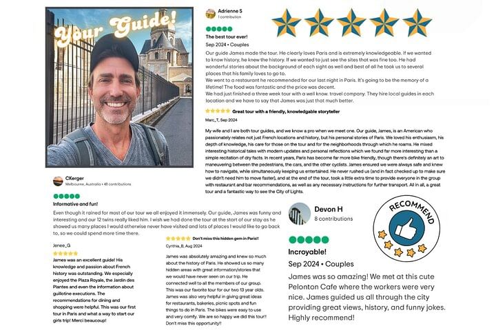 Meet James, an American who married a Parisian and made the city his home. Combining local knowledge with an outsider's perspective, he shares insights to help you navigate Paris like a local. As a photographer, he'll gladly point out the best photo spots and take pictures of your group with your mobile device or camera.